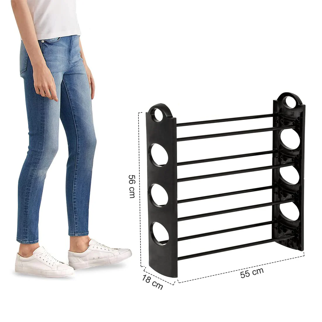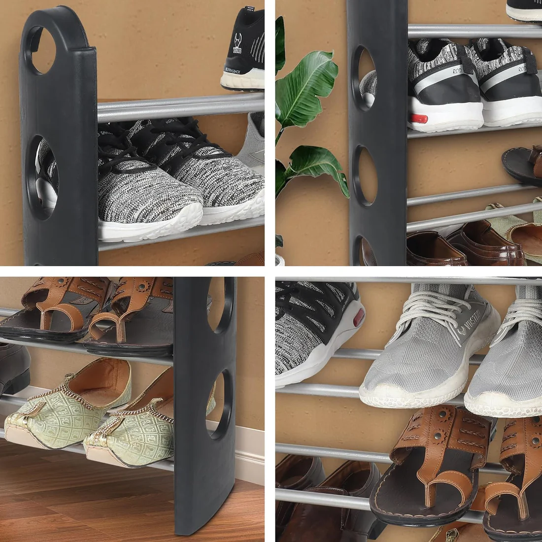 The smooth plastic surface is easy to clean and resistant to moisture, making it suitable for all seasons. Whether you store slippers, sandals, or shoes, this rack ensures proper ventilation and quick access. The modern black color blends seamlessly with any home décor style.
